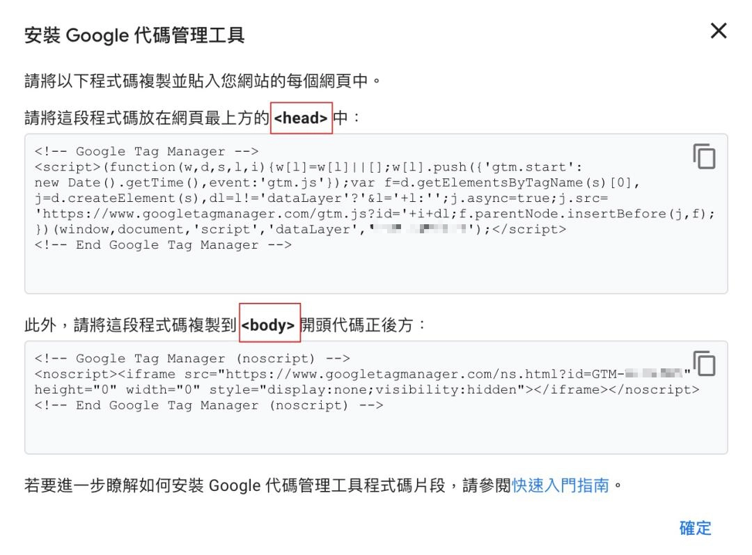 貼上於GTM取得的程式碼,並按下確定