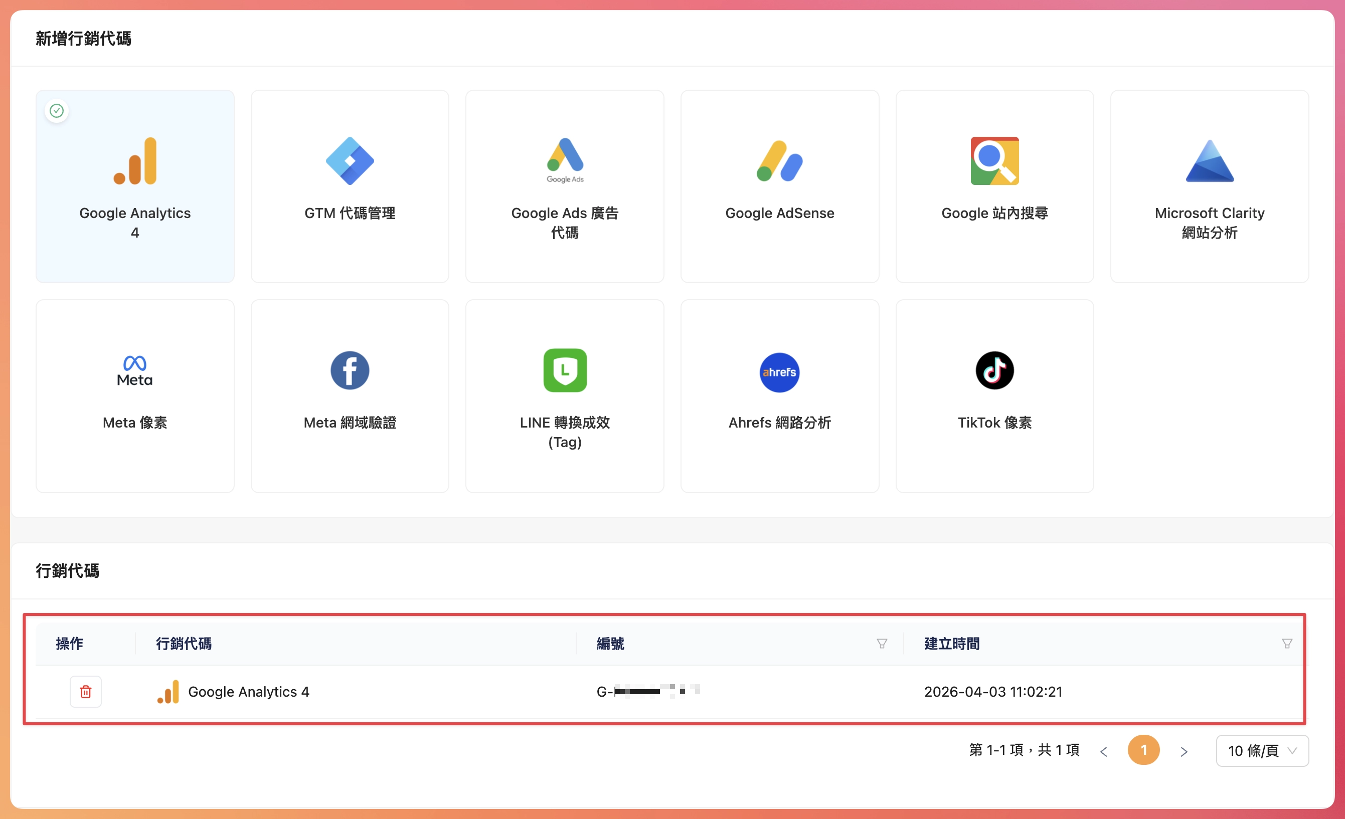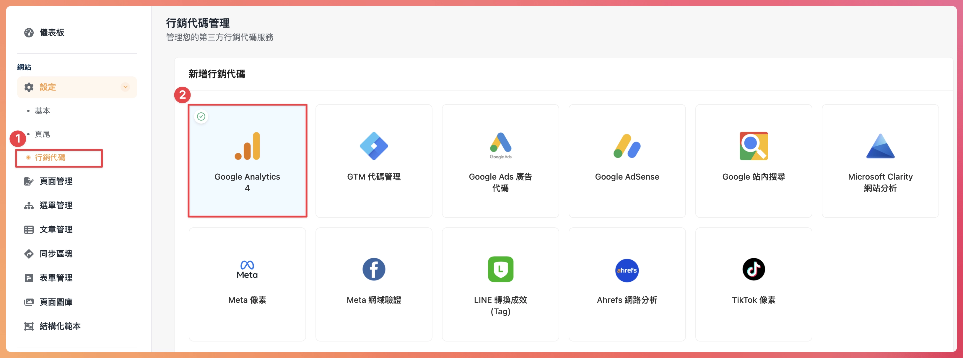 首先至“行銷代碼”進行後續設定,以下為“行銷代碼”的畫面